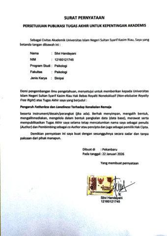 SILVI HANDAYANI, - (2026) PENGARUH FATHERLESS DAN LONELINESS TERHADAP KENAKALAN REMAJA. Skripsi thesis, Universitas Islam Negeri Sultan Syarif Kasim Riau.