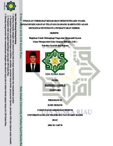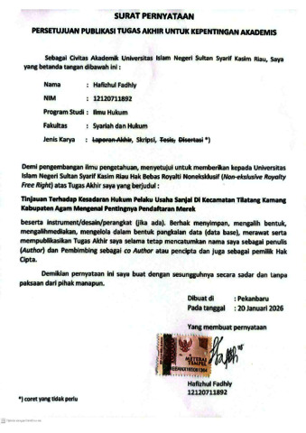HAFIZHUL FADHLY (2026) TINJAUAN TERHADAP KESADARAN HUKUM PELAKU USAHA SANJAI DI KECAMATAN TILATANG KAMANG KABUPATEN AGAM MENGENAI PENTINGNYA PENDAFTARAN MEREK. Skripsi thesis, Universitas Islam Negeri Sultan Syarif Kasim.