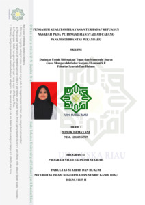 ABSTRAK Wiwik Damayani (2025) : Pengaruh Kualitas Pelayanan Terhadap Kepuasan Nasabah Pada PT. Pengadaian Syariah Cabang Panam Soebrantas Pekanbaru Penelitian ini bertujuan untuk mengetahui apakah terdapat pengaruh kualitas pelayanan terhadap kepuasan nasabah pada PT Pegadaian Syariah cabang Pananm Soebrantas Pekanbaru. Bagaimana pengaruh kualitas pelayanan terhadap kepuasan nasabah pada PT Pegadaian Syariah cabang Pananm Soebrantas Pekanbaru menurut perspektif Ekonomi Syariah. Metode yang digunakan dalam penelitian ini adalah pendekatan kuantitatif. Populasi penelitian mencakup seluruh nasabah PT Pegadaian Syariah Cabang Panam Soebrantas Pekanbaru, dengan jumlah sampel sebanyak 98 responden yang dipilih menggunakan teknik accidental sampling. Metode pengumpulan data yaitu observasi, kuesioner, wawancara, dokumentasi dan teknik analisis datanya menggunakan regresi linier sederhana. Pengujian hipotesis dilakukan dengan analisis regresi linear sederhana serta uji t (uji parsial) menggunakan program SPSS versi 26. Hasil penelitian menunjukkan bahwa terdapat pengaruh positif dan signifikan antara Kualitas Pelayanan Dan Kepuasan Nasabah. Berdasarkan hasil analisis regresi linear sederhana adalah sebagai berikut Y = 8.508 + 0.213 X, berdasarkan hasil uji hipotesis uji t diketahui bahwa nilai thitung sebesar 4.200 > ttabel sebesar 0.1985, uji koefisien determinasi (R2) dapat memiliki R Square sebesar 0,155 artinya besarnya pengaruh Kualitas Pelayanan (X) terhadap Kepuasan Nasabah (Y) adalah sebesar 15,5% sedangkan sisanya sebesar 84,5% dipengaruhi dari variabel yang tidak termasuk dalam variabel penelitian ini. Untuk korelasi sebesar 0,394 yang berarti bahwa hubungan antara Kualitas Pelayanan terhadap Kepuasan Nasabah adalah lemah. Kata Kunci: Kualitas Pelayanan, Kepuasan Nasabah, Ekonomi Syariah