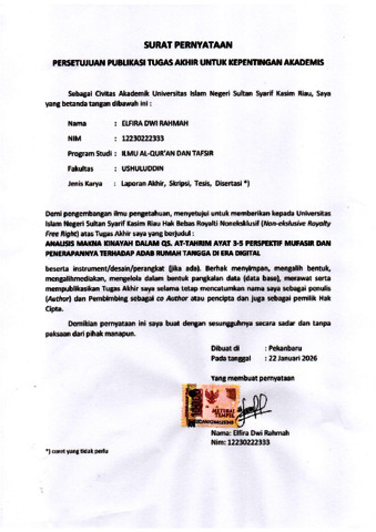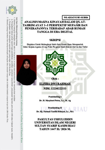 ELFIRA DWI RAHMAH, - (2026) ANALISIS MAKNA KINAYAH DALAM QS. AT-TAHRIM AYAT 3–5 PERSPEKTIF MUFASIR DAN PENERAPANNYA TERHADAP ADAB RUMAH TANGGA DI ERA DIGITAL. Skripsi thesis, Universitas Islam Negeri Sultan Syarif Kasim Riau.