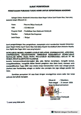 NASYWA DHIYA FAUZIYYAH (2026) PENGARUH MODEL PEMBELAJARAN RELATING, EXPERIENCING, APPLYING, COOPERATING, TRANSFERRING TERHADAP KEMAMPUAN PEMECAHAN MASALAH SISWA PADA MATA PELAJARAN MATEMATIKA KELAS IV MI NURUL IMAN KABUPATEN KAMPAR. Skripsi thesis, UNIVERSITAS ISLAM NEGERI SULTAN SYARIF KASIM RIAU.