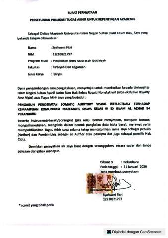 SYAHWENI FITRI (2026) PENGARUH PENDEKATAN SOMATIC AUDITORY VISUAL INTELECTUALY TERHADAP KEMAMPUAN KOMUNIKASI MATEMATIS SISWA KELAS III SD ISLAM AL AZHAR 54 PEKANBARU. Skripsi thesis, UNIVERSITAS ISLAM NEGERI SULTAN SYARIF KASIM RIAU.