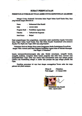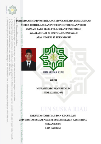 ABSTRAK Muhammad Irfan Rizaldi, (2025): Perbedaan Motivasi Belajar Siswa antara Penggunaan Media Pembelajaran Powerpoint dengan Video Animasi pada Mata Pelajaran Pendidikan Agama Islam di Sekolah Menengah Atas Negeri 15 Pekanbaru Penelitian ini bertujuan untuk menguji perbedaan motivasi belajar siswa antara penggunaan media pembelajaran PowerPoint dengan video animasi pada mata pelajaran Pendidikan Agama Islam di Sekolah Menengah Atas Negeri 15 Pekanbaru. Penelitian ini menggunakan pendekatan kuantitatif dengan jenis penelitian komparatif. Populasi dalam penelitian 254 siswa kelas XI yang beragama Islam . Sampel penelitian berjumlah 36 siswa kelas XI A Sekolah Menengah Atas Negeri 15 Pekanbaru, yang dipilih melalui teknik purposive sampling. Hasil penelitian menunjukkan bahwa motivasi belajar siswa pada pembelajaran menggunakan PowerPoint memperoleh nilai rata-rata 41,02, sedangkan pembelajaran menggunakan video animasi memperoleh nilai rata-rata 42,27. Hasil Paired Sample t-test menunjukkan nilai Sig 0,029 < 0,05, yang berarti Ha diterima dan H0 ditolak. Dengan demikian, terdapat perbedaan yang signifikan motivasi belajar siswa antara penggunaan media pembelajaran PowerPoint dengan video animasi pada mata pelajaran Pendidikan Agama Islam di Sekolah Menengah Atas Negeri 15 Pekanbaru. Kata Kunci: Motivasi Belajar, Media Pembelajaran, PowerPoint, Video Animasi.