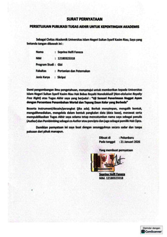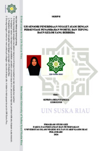 SEPRINA HELFI FANEZA, - (2026) UJI SENSORI PENERIMAAN NUGGET AYAM DENGAN PERSENTASE PENAMBAHAN WORTEL DAN TEPUNG DAUN KELOR YANG BERBEDA. Skripsi thesis, UNIVERSITAS ISLAM NEGERI SULTAN SYARIF KASIM RIAU.