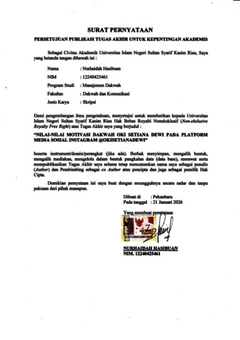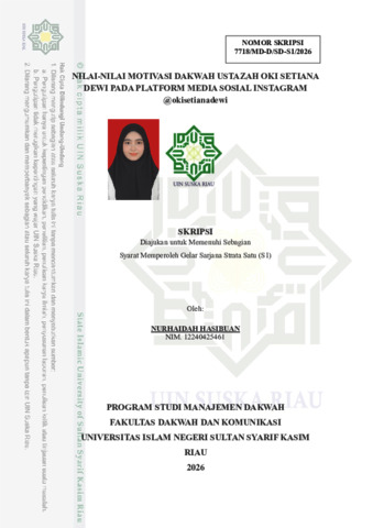 NURHAIDAH HASIBUAN, - (2026) NILAI-NILAI MOTIVASI DAKWAH USTAZAH OKI SETIANA DEWI PADA PLATFORM MEDIA SOSIAL INSTAGRAM @okisetianadewi. Skripsi thesis, UNIVERSITAS ISLAM NEGERI SULTAN SYARIF KASIM RIAU.