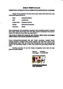 ABSTRAK Nama: Nurhaidah Hasibuan Prodi: Manajemen Dakwah Judul: Nilai-nilai Motivasi Dakwah Oki Setiana Dewi Pada Platform Media Sosial Instagram @okisetianadewi Penelitian ini bertujuan untuk menganalisis nilai-nilai motivasi dakwah Ustazah Oki Setiana Dewi pada akun Instagram @okisetianadewi dengan menggunakan kerangka teori dakwah Islam yang mencakup aspek spiritual, moral, dan sosial. Penelitian dilakukan melalui pendekatan kualitatif dengan metode analisis isi terhadap 19 postingan terpilih berupa reels, video, dan kutipan Islami. Hasil penelitian menunjukkan bahwa konten dakwah Ustazah Oki menempatkan penguatan akidah dan ketauhidan sebagai fondasi spiritual, yang berfungsi membangun ketenangan batin dan kedekatan audiens kepada Allah SWT. Pada aspek moral, dakwah yang disampaikan membentuk karakter Islami melalui ajakan menjaga akhlak, kesabaran dalam parenting, etika rumah tangga, serta konsistensi dalam ibadah sehari-hari. Sementara itu, pada aspek sosial, konten dakwah diarahkan untuk meningkatkan kepedulian terhadap sesama dan keluarga, seperti doa untuk Palestina, anjuran sedekah jariyah, dan penguatan silaturahmi. Penelitian ini menyimpulkan bahwa dakwah digital Ustazah Oki di Instagram efektif dalam membina spiritualitas, memperkuat moral, dan membangun solidaritas sosial umat, sehingga memberikan kontribusi teoretis dan praktis bagi pengembangan manajemen dakwah digital di era media sosial. Kata kunci: Motivasi dakwah, Oki Setiana Dewi, Instagram, Nilai Islami Hierarkis, Analisis Konten.