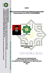 KERAGAMAN KUALITATIF DAN KUANTITATIF TANAMAN DUKU (Lansium domesticum Corr) DI TIGA LOKASI BERBEDA Fiqri Ladoni Syahri (12180213323) Dibawah Bimbingan Zulfahmi dan Irwan Taslapratama INTISARI Duku merupakan salah satu tanaman buah lokal yang bernilai tinggi namun belum dikarakterisasi, karakterisasi ini penting dilakukan untuk konservasi, pemuliaan tanaman dan pengembangan sumber daya genetik. Penelitian ini bertujuan untuk mengetahui tingkat keragaman karakter kualitatif dan karakter kuantitatif tanaman duku (Lansium domesticum Corr) di tiga lokasi berbeda, yaitu Desa Binuang Kecamatan Bangkinang Kota, Desa Pangkalan Baru Kecamatan Siak Hulu dan Desa Redang Kecamatan Rengat Barat. Pengambilan sampel dilakukan di 3 lokasi dengan 10 tanaman perlokasi sehingga diperoleh 30 tanaman sampel. Parameter kualitatif yang diamati meliputi bentuk dan warna bagian tanaman seperti daun, bunga, dan buah, sedangkan parameter kuantitatif meliputi panjang dan diameter buah, berat biji, kadar air, serta kadar vitamin C. Data diperoleh dianalisis indeks keanekaragaman Shannon-Weaver untuk karakter kualitatif dan koefisien variasi (CV) untuk karakter kuantitatif. Hasil penelitian ini menunjukkan bahwa tingkat keragaman karakter kualitatif tanaman duku tergolong sedang dengan nilai rata-rata indeks Shannon-Weaver 0,52. Tingkat keragaman karakter kuantitatif tanaman duku pada 3 lokasi adalah berkategori sedang namun ada beberapa karakter yang memiliki nilai koefisin variasi tinggi (>20%) yaitu total asam tertritrasi, padatan terlarut total, jumlah biji, bunga per tandan, panjang biji, vitamin C, tinggi tanaman, bobot buah utuh dan berat daging buah. Berdasarkan analisis dendogram, 30 tanaman sampel dikelompokkan menjadi 3 kluster dimana dalam 1 kluster terdapat pencampuran tanaman dari berbagai lokasi. Temuan penelitian ini dapat digunakan sebagai dasar untuk kegiatan konservasi dan pemuliaan tanaman duku di masa depan. Kata kunci: Lansium domesticum, keragaman, morfologi, Shannon-Weaver, koefisien variasi