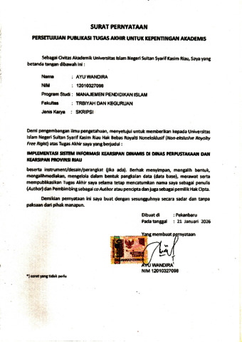 AYU WANDIRA, - (2026) IMPLEMENTASI SISTEM INFORMASI KEARSIPAN DINAMIS DI DINAS PERPUSTAKAAN DAN KEARSIPAN PROVINSI RIAU. Skripsi thesis, Universitas Islam Negeri Sultan Syarif Kasim Riau.