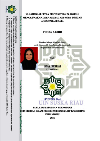 IRMA FITRIANI, - (2026) KLASIFIKASI CITRA PENYAKIT DAUN JAGUNG MENGGUNAKAN DEEP NEURAL NETWORK DENGAN AUGMENTASI DATA. Skripsi thesis, UNIVERSITAS ISLAM NEGERI SULTAN SYARIF KASIM RIAU.