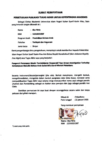 EKA FITRIA, - (2026) PENGARUH PENERAPAN MODEL PEMBELAJARAN KOOPERATIF GROUP INVESTIGATION TERHADAP KEMAMPUAN MENULIS BAHASA ARAB SANTRI MTS DARUL HIKMAH PEKANBARU. Skripsi thesis, Universitas Islam Negeri Sultan Syarif Kasim Riau.