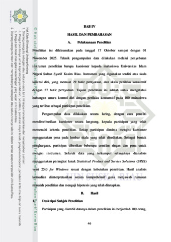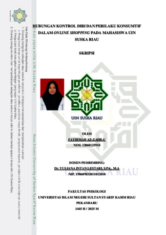 HUBUNGAN KONTROL DIRI DAN PERILAKU KONSUMTIF DALAM ONLINE SHOPPING PADA MAHASISWA UIN SUSKA RIAU Fathimah Az-Zahra‟ Email: fz87553@gmail.com Fakultas Psikologi Universitas Islam Negeri Sultan Syarif Kasim Riau ABSTRAK Perkembangan teknologi digital telah mengubah pola konsumsi masyarakat, termasuk kalangan mahasiswa, dari berbelanja di kedai/toko ke berbelanja secara daring. Kemudahan akses dan berbagai tawaran menarik dari platform ecommerce sering kali membuat mahasiswa sulit menahan keinginan untuk membeli barang sehingga meningkatkan perilaku konsumtif mereka. Penelitian ini bertujuan mengetahui hubungan antara kontrol diri dan perilaku konsumtif dalam online shopping pada mahasiswa UIN Suska Riau dengan jumlah subjek penelitian sebanyak 100 orang mahasiswa. Penelitian ini menggunakan metode kuantitatif dengan skala kontrol diri dan perilaku konsumtif sebagai alat untuk mengumpulkan data. Teknik analisis data yang digunakan adalah korelasi product moment dengan menghasilkan R sebesar -0.415 dengan (p) 0.000 (p0,01). Hasil analisis data tersebut menunjukkan adanya hubungan yang sangat signifikan antara kontrol diri dengan perilaku konsumtif. Berdasarkan hasil penelitian disimpulkan bahwa terdapat hubungan yang signifikan antara variabel kontrol diri dan perilaku konsumtif dalam online shopping pada mahasiswa UIN Suska Riau. Kata Kunci: Kontrol Diri, Perilaku Konsumtif, Belanja Online, Mahasiswa