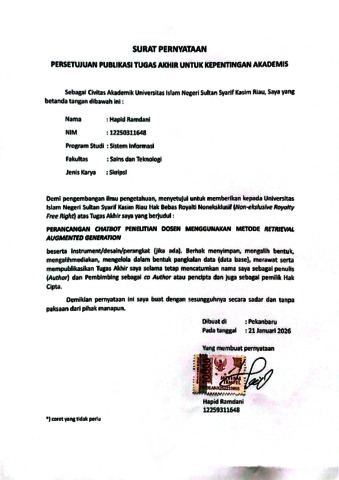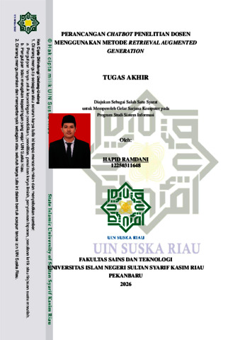 HAPID RAMDANI, - (2026) PERANCANGAN CHATBOT PENELITIAN DOSEN MENGGUNAKAN METODE RETRIEVAL AUGMENTED GENERATION. Skripsi thesis, UNIVERSITAS ISLAM NEGERI SULTAN SYARIF KASIM RIAU.