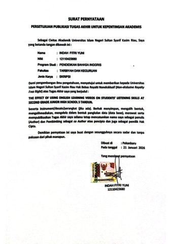 INDAH FITRI YUNI, - (2026) THE EFFECT OF USING ENGLISH LEARNING VIDEOS ON STUDENTS’ LISTENING SKILLS AT SECOND GRADE JUNIOR HIGH SCHOOL 5 TANDUN. Skripsi thesis, UNIVERSITAS ISLAM NEGERI SULTAN SYARIF KASIM RIAU.