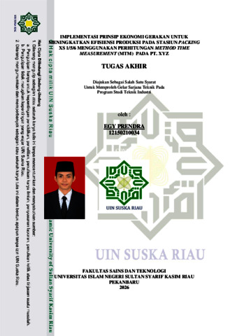 EGY PRENDRA, - (2026) IMPLEMENTASI PRINSIP EKONOMI GERAKAN UNTUK MENINGKATKAN EFISIENSI PRODUKSI PADA STASIUN PACKING XS 1/5/6 MENGGUNAKAN PERHITUNGAN METHOD TIME MEASUREMENT (MTM) PADA PT. XYZ. Skripsi thesis, UNIVERSITAS ISLAM NEGERI SULTAN SYARIF KASIM RIAU.