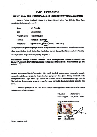IMPLEMENTASI PRINSIP EKONOMI GERAKAN UNTUK MENINGKATKAN EFISIENSI PRODUKSI PADA STASIUN PACKING XS 1/5/6 MENGGUNAKAN PERHITUNGAN METHOD TIME MEASUREMENT (MTM) PADA PT. XYZ EGY PRENDRA NIM. 12150210034 Program Studi Teknik Industri Fakultas Sains Dan Teknologi Universitas Islam Negeri Sultan Syarif Kasim Riau Jl. HR. Subrantas No.155, Pekanbaru ABSTRAK Penelitian ini bertujuan untuk meningkatkan efisiensi produksi di Stasiun Pengemasan XS 1/5/6 PT. XYZ, yang menghadapi tantangan dalam memenuhi kapasitas produksi, mengakibatkan 107 jam lembur tahunan, dengan menerapkan prinsip-prinsip ekonomi gerak dan perhitungan Method Time Measurement (MTM). Berdasarkan analisis gerak kerja, pemborosan waktu sebesar 203,5 TMU teridentifikasi pada elemen pengemasan kotak karton dan penimbangan produk, yang diklasifikasikan sebagai pemborosan waktu yang tidak menambah nilai. Peningkatan sistem kerja dilakukan dengan menghilangkan aktivitas penimbangan manual dan mengintegrasikan sensor fotoelektrik untuk penghitungan otomatis, mengurangi waktu standar dari 8.241 TMU (4,94 menit) menjadi 7.652 TMU (4,6 menit), yang mewakili peningkatan efisiensi sebesar 7%. Produksi yang diusulkan meningkat dari 1.051.248 unit/tahun (269 unit/jam) menjadi 1.142.718 unit/tahun (287 unit/jam), dan produktivitas kerja naik menjadi 107,73%. Hasil ini menunjukkan bahwa penerapan prinsip ekonomi gerak dan MTM berhasil mengoptimalkan proses pengemasan, mengurangi biaya operasional, dan menghilangkan kebutuhan lembur. Kata Kunci: Studi Waktu, Method Time Measurement, Efisiensi Kerja, Waktu baku, Produktivitas.