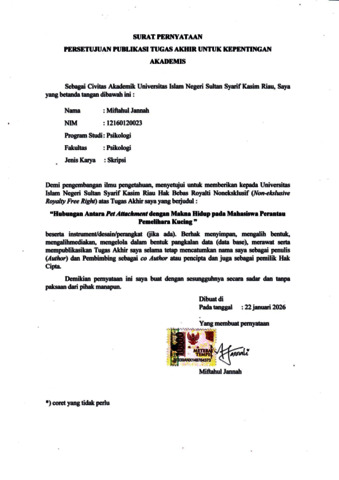 MIFTAHUL JANNAH, - (2026) HUBUNGAN ANTARA PET ATTACHMENT DENGAN MAKNA HIDUP PADA MAHASISWA PERANTAU PEMELIHARA KUCING. Skripsi thesis, UNIVERSITAS ISLAM NEGERI SULTAN SYARIF KASIM RIAU.
