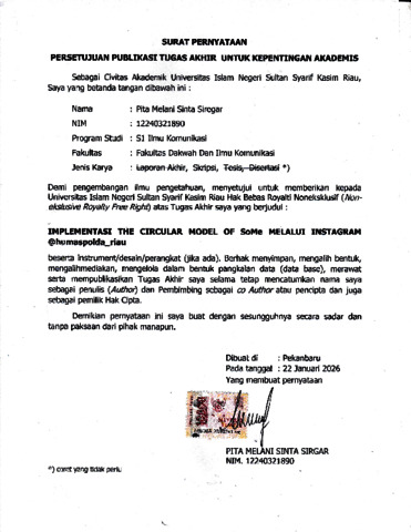 PITA MELANI SINTA SIREGAR, - (2026) IMPLEMENTASI THE CIRCULAR MODEL OF SoMe MELALUI INSTAGRAM @humaspolda_riau. Skripsi thesis, Universitas Islam Negeri Sultan Syarif Kasim Riau.
