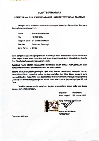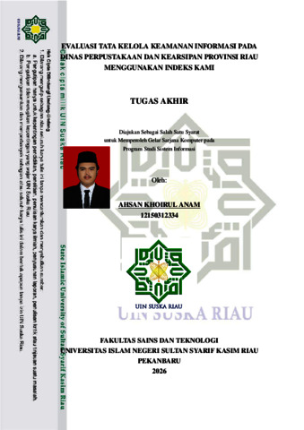 AHSAN KHOIRUL ANAM, - (2026) EVALUASI TATA KELOLA KEAMANAN INFORMASI PADA DINAS PERPUSTAKAAN DAN KEARSIPAN PROVINSI RIAU MENGGUNAKAN INDEKS KAMI. Skripsi thesis, UNIVERSITAS ISLAM NEGERI SULTAN SYARIF KASIM RIAU.