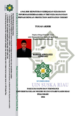 RAHMAT AFRIYANTO, - (2026) ANALISIS KEPATUHAN KEBIJAKAN KEAMANAN INFORMASI BERDASARKAN TREN KEAMANAN DAN PRIVASI DENGAN PROTECTION MOTIVATION THEORY. Skripsi thesis, UNIVERSITAS ISLAM NEGERI SULTAN SYARIF KASIM RIAU.