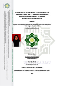 ABSTRAK Nabila Aprinovelin, (2025): Pengaruh Efektivitas Sistem Tanggung Renteng Terhadap Kredit Macet Permodalan Nasional Madani (PNM) Mekaar Unit Akabiluru Perspektif Ekonomi Syariah. Di kalangan masyarakat khususnya perempuan melakukan usaha untuk memenuhi kebutuhan, dimana untuk melakukan usaha tersebut perlu modal yang banyak. Tingginya modal yang diperlukan, mendorong hadirnya program pembiayaan PNM Mekaar yang dikhususkan bagi perempuan prasejahtera dengan menerapkan sistem tanggung renteng untuk mengatasi kredit macet. Namun, di Unit Akabiluru ditemukannya kredit macet yaitu sebanyak 60 nasabah pada tahun 2023. Hal ini perlu diperhatikan meskipun pembiayaan menggunakan sistem tanggung renteng. Penelitian ini bertujuan untuk mengetahui pengaruh efektivitas sistem tanggung renteng terhadap kredit macet dalam perspektif ekonomi syariah. Penelitian ini menggunakan metode kuantitatif dengan penelitian di lapangan. Data dikumpulkan melalui pembagian kusioner kepada 60 populasi yang semuanya dijadikan sampel (responden) disebut teknik total sampling. Teknik analisis data meliputi uji validitas, reliabilitas, uji asumsi klasik, regresi linear sederhana, dan uji hipotesis menggunakan SPSS. Hasil penelitian menunjukkan bahwa sistem tanggung renteng berpengaruh secara signifikan dalam mengatasi kredit macet, dimana hasil uji menunjukkan nilai sebesar 24,748 secara parsial dan 91,3% secara koefisien determinasi