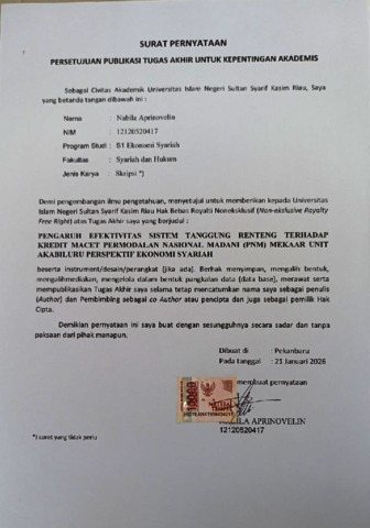 NABILA APRINOVELIN, - (2026) PENGARUH EFEKTIVITAS SISTEM TANGGUNG RENTENG TERHADAP KREDIT MACET PERMODALAN NASIONAL MADANI (PNM) MEKAAR UNIT AKABILURU PERSPEKTIF EKONOMI SYARIAH. Skripsi thesis, UNIVERSITAS ISLAM NEGERI SULTAN SYARIF KASIM RIAU.