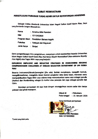 AZZAHRA ALFITRI RAMDANI, - (2026) EXPLORING IMPULSIVE AND REFLECTIVE STRATEGIES IN OVERCOMING READING COMPREHENSION CHALLENGES AT ENGLISH EDUCATION DEPARTMENT OF UIN SUSKA RIAU. Skripsi thesis, Universitas Islam Negeri Sultan Syarif Kasim Riau.
