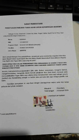 MARDIAH, - (2026) PERAN KEPALA DESA DALAM PEMBANGUNAN DESA BERDASARKAN UU NOMOR 3 TAHUN 2024 TENTANG DESA DI DESA SIHIUK KECAMATAN LUBUK BARUMUN KABUPATEN PADANG LAWAS PERSFEKTIF FIQH SIYASAH. Skripsi thesis, UNIVERSITAS ISLAM NEGERI SULTAN SYARIF KASIM RIAU.