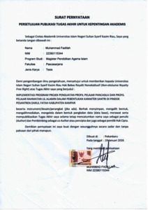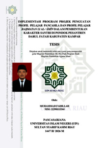 MUHAMMAD FADILLAH, - (2026) IMPLEMENTASI PROGRAM PROJEK PENGUATAN PROFIL PELAJAR PANCASILA DAN PROFIL PELAJAR RAḤMATAN LIL ALĀMĪN DALAM PEMBENTUKAN KARAKTER SANTRI DI PONDOK PESANTREN DARUL FATAH KABUPATEN KAMPAR. Thesis thesis, UNIVERSITAS ISLAM NEGERI SULTAN SYARIF KASIM RIAU.