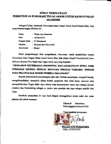WULAN AYU NURANNISA, - (2026) PENGARUH KECERDASAN EMOSIONAL DAN LINGKUNGAN KERJA FISIK TERHADAP KINERJA DENGAN MOTIVASI SEBAGAI VARIABEL MEDIASI PADA PEGAWAI SLBN PEMBINA KOTA PEKANBARU. Skripsi thesis, UNIVERSITAS ISLAM NEGERI SULTAN SYARIF KASIM RIAU.