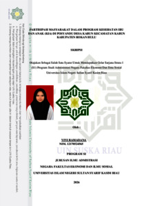 ABSTRAK PARTISIPASI MASYARAKAT DALAM PROGRAM KESEHATAN IBU DAN ANAK (KIA) DI POSYANDU DESA KABUN KECAMATAN KABUN KABUPATEN ROKAN HULU Oleh : Vivi Ramadana NIM. 12170524565 Penelitian ini bertujuan untuk menganalisis partisipasi masyarakat dalam Program Kesehatan Ibu dan Anak (KIA) di Posyandu Desa Kabun Kecamatan Kabun Kabupaten Rokan Hulu serta mengidentifikasi faktor-faktor yang menghambat partisipasi tersebut. Penelitian ini menggunakan metode kualitatif deskriptif dengan teknik pengumpulan data melalui wawancara, observasi, dan dokumentasi. Informan penelitian berjumlah 13 orang yang terdiri atas bidan desa, kader posyandu, ibu hamil, ibu balita, kepala desa, dan kepala seksi pelayanan desa. Analisis data dilakukan menggunakan model Miles dan Huberman yang meliputi reduksi data, penyajian data, dan penarikan kesimpulan. Kerangka teori yang digunakan adalah teori partisipasi masyarakat menurut Cohen dan Uphoff (dalam Karim, Kusuma, &Amalia, 2017) serta teori faktor penghambat partisipasi menurut Rahardjo (dalam Adisasmita, 2006). Hasil penelitian menunjukkan bahwa partisipasi masyarakat dalam Program KIA di Posyandu Desa Kabun masih belum optimal dan belum merata pada setiap tahapan partisipasi, yaitu pengambilan keputusan, pelaksanaan, pemanfaatan hasil, dan evaluasi. Partisipasi ibu hamil relatif lebih baik dibandingkan dengan partisipasi ibu balita, yang dipengaruhi oleh kesadaran akan pentingnya pemeriksaan kehamilan. Namun, partisipasi ibu balita masih tergolong rendah, terutama dalam kehadiran dan keterlibatan aktif dalam kegiatan posyandu. Faktor-faktor yang menghambat partisipasi masyarakat meliputi sikap masyarakat yang dipengaruhi oleh ketakutan terhadap imunisasi akibat informasi yang tidak benar, kondisi tipologi wilayah, letak geografis yang menyulitkan akses ke posyandu, kondisi ekonomi masyarakat, serta jumlah penduduk yang berdampak pada ketidakseimbangan antara jumlah sasaran dan tingkat partisipasi. Oleh karena itu, diperlukan upaya peningkatan edukasi kesehatan dan perbaikan pola pelaksanaan kegiatan guna meningkatkan partisipasi masyarakat dalam Program KIA di Desa Kabun. Kata Kunci: partisipasi masyarakat, program kesehatan ibu dan anak, posyandu, Desa Kabun