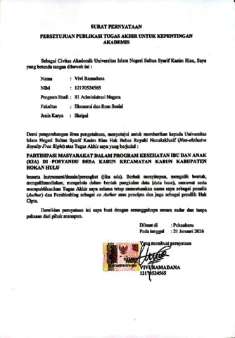 VIVI RAMADANA, - (2026) PARTISIPASI MASYARAKAT DALAM PROGRAM KESEHATAN IBU DAN ANAK (KIA) DI POSYANDU DESA KABUN KECAMATAN KABUN KABUPATEN ROKAN HULU. Skripsi thesis, UNIVERSITAS ISLAM NEGERI SULTAN SYARIF KASIM RIAU.