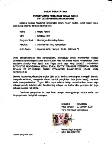 REGITA AGUSTI, - (2026) PENGARUH INTENSITAS PENGGUNAAN MEDIA SOSIAL TIKTOK TERHADAP KESEHATAN MENTAL PADA REMAJA DI KELURAHAN NAPAR KECAMATAN PAYAKUMBUH UTARA KOTA PAYAKUMBUH. Skripsi thesis, Universitas Islam Negeri Sultan Syarif Kasim Riau.