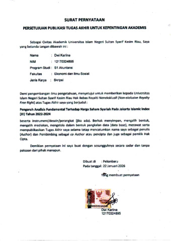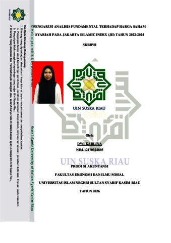DWI KARLINA, - (2026) PENGARUH ANALISIS FUNDAMENTAL TERHADAP HARGA SAHAM SYARIAH PADA JAKARTA ISLAMIC INDEX (JII) TAHUN 2022-2024. Skripsi thesis, UNIVERSITAS ISLAM NEGERI SULTAN SYARIF KASIM RIAU.