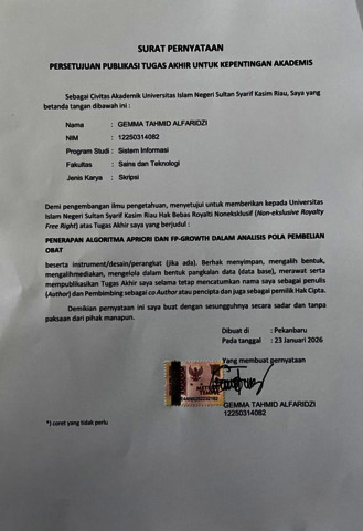 GEMMA TAHMID ALFARIDZI, - (2026) PENERAPAN ALGORITMA APRIORI DAN FP-GROWTH DALAM ANALISIS POLA PEMBELIAN OBAT. Skripsi thesis, Universitas Islam Negeri Sultan Syarif Kasim Riau.