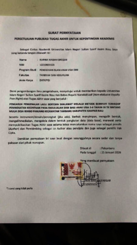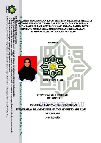 KURNIA WASIAH SIREGAR (2026) PENGARUH PENGENALAN LAGU BERTEMA SHALAWAT MELALUI METODE BERNYAYI TERHADAP PENINGKATAN KECINTAAN PADA RASULULLAH SAW BAGI ANAK USIA 5-6 TAHUN DI TK BINTANG MULIA DESA RIMBO PANJANG KECAMATAN TAMBANG KABUPATEN KAMPAR RIAU. Skripsi thesis, Universitas Islam Negeri Sultan Syarif Kasim.