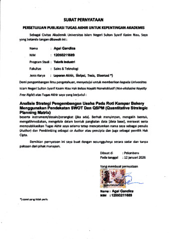 AGEL GANDIZA, - (2026) ANALISIS STRATEGI PENGEMBANGAN USAHA PADA ROTI KAMPAR BAKERY MENGGUNAKAN PENDEKATAN SWOT DAN QSPM (QUANTITATIVE STRATEGIC PLANNING MATRIX). Skripsi thesis, Universitas Islam Negeri Sultan Syarif Kasim Riau.