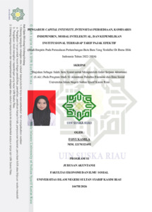 i ABSTRAK PENGARUH CAPITAL INTENSITY, INTENSITAS PERSEDIAAN, KOMISARIS INDEPENDEN, MODAL INTELEKTUAL, DAN KEPEMILIKAN INSTITUSIONAL TERHADAP TARIF PAJAK EFEKTIF (Studi Empiris Pada Perusahaan Pertambangan Batu Bara Yang Terdaftar Di Bursa Efek Indonesia Tahun 2022-2024) Oleh: FONY KAMILA NIM. 12170321492 Tarif Pajak Efektif merupakan indikator penting dalam menilai efektivitas pengelolaan pajak perusahaan serta mencerminkan strategi perencanaan pajak yang diterapkan oleh manajemen. Penelitian ini bertujuan untuk menganalisis pengaruh Capital Intensity, Intensitas Persediaan, Komisaris Independen, Modal Intelektual, dan Kepemilikan Institusional terhadap Tarif Pajak Efektif pada perusahaan pertambangan batu bara yang terdaftar di Bursa Efek Indonesia (BEI) periode 2022–2024. Penelitian ini menggunakan pendekatan kuantitatif dengan data sekunder yang diperoleh dari laporan keuangan tahunan perusahaan. Sampel penelitian ditentukan menggunakan metode purposive sampling sesuai dengan kriteria yang telah ditetapkan. Analisis data dilakukan menggunakan regresi data panel. Hasil penelitian menunjukkan bahwa Capital Intensity, Intensitas Persediaan, dan Kepemilikan Institusional berpengaruh positif signifikan terhadap Tarif Pajak Efektif, sedangkan Komisaris Independen berpengaruh negatif signifikan terhadap Tarif Pajak Efektif. Sementara itu, Modal Intelektual tidak menunjukkan pengaruh terhadap Tarif Pajak Efektif. Temuan ini menunjukkan bahwa karakteristik aset, struktur persediaan, serta mekanisme tata kelola perusahaan memiliki peran penting dalam menentukan besarnya Tarif Pajak Efektif pada perusahaan pertambangan batu bara. Kata Kunci: Capital Intensity, Intensitas Persediaan, Komisaris Independen, Modal Intelektual, Kepemilikan Institusional, Tarif Pajak Efektif