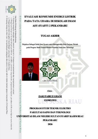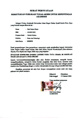 EVALUASI KONSUMSI ENERGI LISTRIK DAN TATA UDARA PADA SEKOLAH IMAM ASY-SYAFI’I 2 PEKANBARU Zaki Fairuz Ghani NIM : 12150513932 Tanggal Sidang : Tanggal Wisuda : Program Studi Teknik Elektro Fakultas Sains dan Teknologi Universitas Islam Negeri Sultan Syarif Kasim Riau Jl. Soebrantas No. 155 Pekanbaru ABSTRAK Peningkatan konsumsi energi listrik pada sektor publik, khususnya bangunan pendidikan, menuntut adanya pengelolaan energi yang efisien dan berkelanjutan. Sekolah sebagai fasilitas pendidikan memiliki karakteristik konsumsi energi yang didominasi oleh sistem tata udara dan pencahayaan, sehingga berpotensi menimbulkan pemborosan energi apabila tidak dikelola dengan baik. Penelitian ini bertujuan untuk mengevaluasi konsumsi energi listrik serta kinerja sistem tata udara di Sekolah Islam Terpadu Imam Asy-Syafi’i 2 Pekanbaru melalui beberapa penerapan metode. Metode penelitian yang digunakan meliputi audit energi awal dan audit energi rinci dengan menghitung nilai Intensitas Konsumsi Energi (IKE), analisis kebutuhan beban pendinginan ruangan (BTU), serta identifikasi peluang hemat energi (PHE). Objek penelitian difokuskan pada gedung pendidikan yang memiliki dominasi penggunaan AC dengan variasi ukuran dan fungsi ruangan. Hasil audit awal menunjukkan bahwa nilai IKE gedung berada pada kategori cukup efisien, namun hasil audit rinci mengindikasikan adanya beberapa ruangan dengan kategori boros hingga sangat boros, terutama pada ruang kepala sekolah dan pusdatin dengan jam operasional panjang dan kapasitas AC yang melebihi kebutuhan aktual. Sistem tata udara menjadi penyumbang konsumsi energi terbesar di sekolah. Temuan ini didasari oleh akumulasi konsumsi harian yang besar dan perhitungan kebutuhan BTU yang melebihi standar ruangan. Berdasarkan hasil analisis, diperoleh rekomendasi konservasi energi dengan metode update technology, penyesuaian kapasitas AC sesuai kebutuhan ruangan, yang dapat menurunkan konsumsi energi 57,67% penghematan dari pemakaian ruangan sebelumnya. Rekomendasi ini mengurangi biaya konsumsi listrik sebesar Rp. 5.129.784 per – tahun hanya dari ruang kepala sekolah dan pusdatin. Kata Kunci : Audit energi, Intensitas Konsumsi Energi (IKE), tata udara, konsumsi energi listrik, peluang hemat energi, bangunan sekolah.