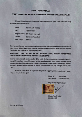 IKHWAN ASH-SHIDDIQI, - (2026) PENERAPAN CONVOLUTIONAL NEURAL NETWORK (CNN) DENGAN PENDEKATAN GRAD-CAM UNTUK KLASIFIKASI PENYAKIT TANAMAN PADI. Skripsi thesis, UNIVERSITAS ISLAM NEGERI SULTAN SYARIF KASIM RIAU.