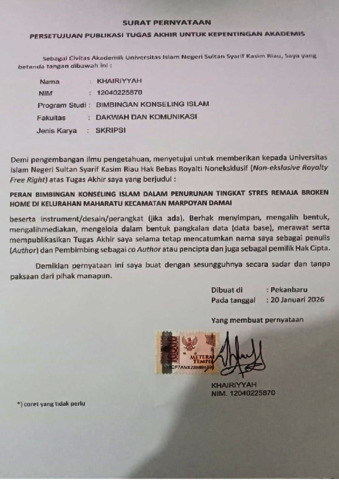 KHAIRIYYAH, - (2026) PERAN BIMBINGAN KONSELING ISLAM DALAM PENURUNAN TINGKAT STRES REMAJA BROKEN HOME DI KELURAHAN MAHARATU KECAMATAN MARPOYAN DAMAI. Skripsi thesis, Universitas Islam Negeri Sultan Syarif Kasim Riau.