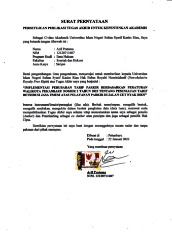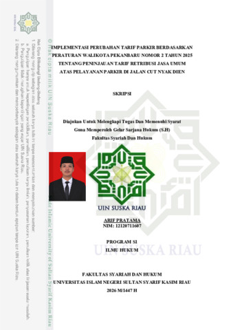 ARIF PRATAMA, - (2026) IMPLEMENTASI PERUBAHAN TARIF PARKIR BERDASARKAN PERATURAN WALIKOTA PEKANBARU NOMOR 2 TAHUN 2025 TENTANG PENINJAUAN TARIF RETRIBUSI JASA UMUM ATAS PELAYANAN PARKIR DI JALAN CUT NYAK DIEN. Skripsi thesis, UNIVERSITAS ISLAM NEGERI SULTAN SYARIF KASIM RIAU.