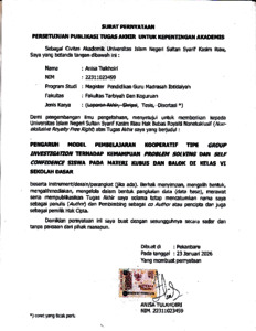 ANISA TULKHOIRI (2026) PENGARUH MODEL PEMBELAJARAN KOOPERATIF TIPE GROUP INVESTIGATION TERHADAP KEMAMPUAN PROBLEM SOLVING DAN SELF CONFIDENCE SISWA PADA MATERI KUBUS DAN BALOK DI KELAS VI SEKOLAH DASAR. Thesis thesis, Universitas Islam Negeri Sultan Syarif Kasim.