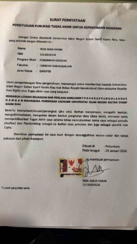 RIZKI AULIA HAKIM (2026) PENGARUH LITERASI KEUANGAN DAN PERILAKU KONSUMEN T E R H A D A P P E N G O L A A N K E U A N G A N MAHASISWA PENDIDIKAN EKONOMI UNIVERSITAS ISLAM NEGERI SULTAN SYARIF KASIM RIAU. Skripsi thesis, Universitas Islam Negeri Sultan Syarif Kasim.