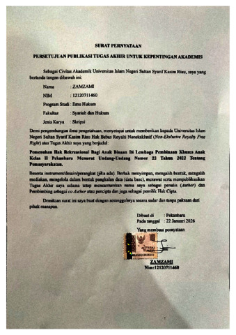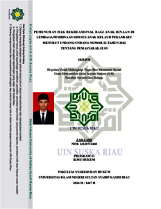 ZAMZAMI, - (2026) PEMENUHAN HAK REKREASIONAL BAGI ANAK BINAAN DI LEMBAGA PEMBINAAN KHUSUS ANAK KELAS II PEKANBARU MENURUT UNDANG-UNDANG NOMOR 22 TAHUN 2022 TENTANG PEMASYARAKATAN. Skripsi thesis, UNIVERSITAS ISLAM NEGERI SULTAN SYARIF KASIM RIAU.