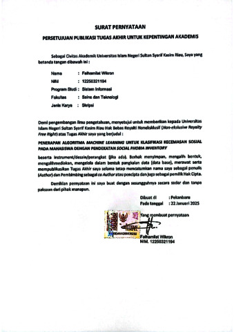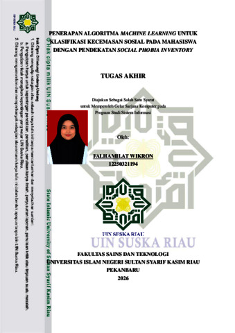 FALHAMILAT WIKRON, - (2026) PENERAPAN ALGORITMA MACHINE LEARNING UNTUK KLASIFIKASI KECEMASAN SOSIAL PADA MAHASISWA DENGAN PENDEKATAN SOCIAL PHOBIA INVENTORY. Skripsi thesis, UNIVERSITAS ISLAM NEGERI SULTAN SYARIF KASIM RIAU.