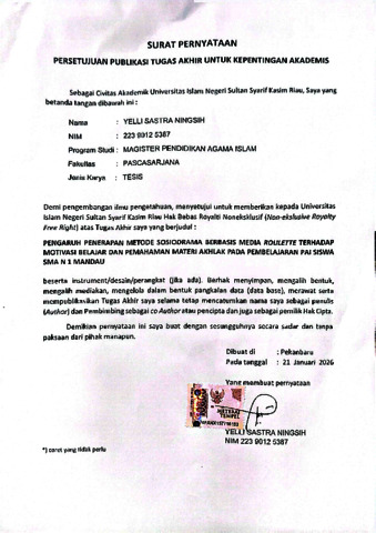 YELLI SATRA NINGSIH, - (2026) PENGARUH PENERAPAN METODE SOSIODRMA BERBASIS MEDIA ROULETTE TERHADAP MOTIVASI BELAJAR DAN PEMAHAMAN MATERI AKHLAK PADA PEMBELAJARAN PAI SISWA SMA N 1 MANDAU. Thesis thesis, UNIVERSITAS ISLAM NEGERI SULTAN SYARIF KASIM RIAU.