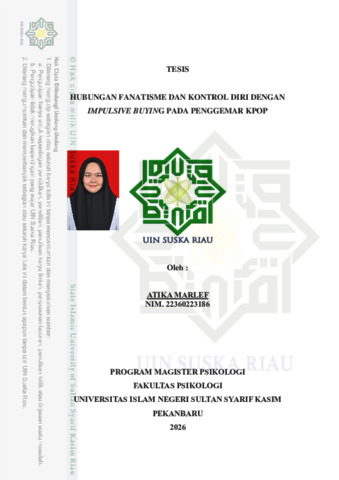 HUBUNGAN FANATISME DAN KONTROL DIRI DENGAN IMPULSIVE BUYING PADA PENGGEMAR K-POP ATIKA MARLEF Magister Psikologi Universitas Islam Negeri Sultan Syarif Kasim Riau atikamarlef@gmail.com ABSTRAK Impulsive buying merupakan pembelian yang dilakukan secara spontan, cepat, tanpa perencanaan, dan seringkali didorong oleh emosi sesaat, yang dialami oleh penggemar K-Pop dalam konteks pembelian produk-produk yang berkaitan dengan idolanya, seperti album, merchandise, tiket konser, dan produk endorse. Penelitian ini bertujuan untuk mengetahui hubungan fanatisme dan kontrol diri dengan impulsive buying pada penggemar K-Pop. Partisipan dalam penelitian ini ialah 217 penggemar K-Pop di Pekanbaru yang diambil dengan menggunakan qouta sampling. Riset ini merupakan penelitian kuantitatif korelasional. Instrument yang digunakan berupa skala fanatisme, skala kontrol diri, dan skala impulsive buying yang telah diuji validitas dan reliabilitasnya. Analisis data dilakukan dengan menggunakan teknik regresi linear berganda. Hasil analisis korelasi product moment menunjukkan bahwa semua variabel berkorelasi signifikan. Hasil penelitian menunjukkan bahwa terdapat hubungan positif yang signifikan antara fanatisme dengan impulsive buying (r = 0.604, p = 0.000), serta hubungan negatif yang signifikan antara kontrol diri dengan impulsive buying (r = -0.464, p = 0.000). Secara simultan, antara fanatisme dan kontrol diri memiliki kontribusi yang signifikan dengan impulsive buying (R2= 0.537, P= 0.000), yang berarti bahwa (53,7%) impulsive buying dapat dijelaskan oleh kedua variabel tersebut. Penelitian ini menunjukkan bahwa semakin tinggi fanatisme dan semakin rendah kontrol diri maka semakin tinggi impulsive buying pada penggemar K-Pop. Kata Kunci: Fanatisme, Kontrol Diri, Impulsive Buying, Penggemar K-Pop