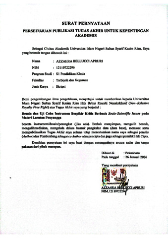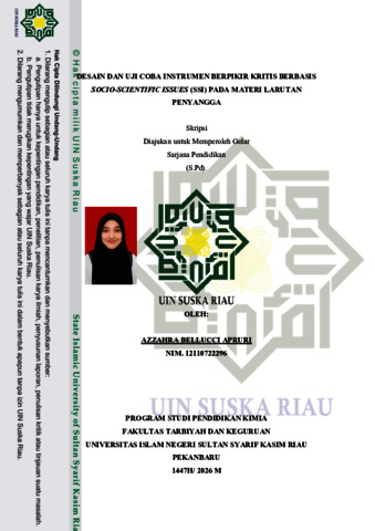 AZZAHRA BELLUCCI APRURI, - (2026) DESAIN DAN UJI COBA INSTRUMEN BERPIKIR KRITIS BERBASIS SOCIO-SCIENTIFIC ISSUES PADA MATERI LARUTAN PENYANGGA. Skripsi thesis, Universitas Islam Negeri Sultan Syarif Kasim Riau.