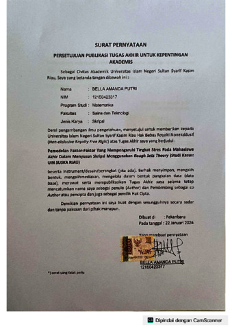 BELLA AMANDA PUTRI (2026) PEMODELAN FAKTOR-FAKTOR YANG MEMPENGARUHI TINGKAT STRES PADA MAHASISWA AKHIR DALAM MENYUSUN SKRIPSI MENGGUNAKAN ROUGH SETS THEORY (STUDI KASUS: UIN SUSKA RIAU). Skripsi thesis, Universitas Islam Negeri Sultan Syarif Kasim.