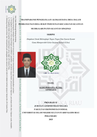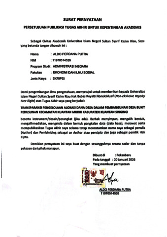 ABSTRAK TRANSPARANSI PENGELOLAAN ALOKASI DANA DESA DALAM PEMBANGUNAN DESA BUKIT PEDUSUNAN KECAMATAN KUANTAN MUDIK KABUPATEN KUANTAN SINGINGI OLEH : ALDO PERDANA PUTRA 11970514526 Penelitian ini bertujuan untuk menganalisis dan mendeskripsikan tingkat transparansi pengelolaan Alokasi Dana Desa (ADD) dalam pembangunan Desa Bukit Pedusunan, serta mengidentifikasi hambatan-hambatan yang dihadapi oleh pemerintah desa. Metode: Penelitian ini menggunakan metode deskriptif dengan pendekatan kualitatif. Data dikumpulkan melalui observasi, wawancara mendalam dengan perangkat desa dan perwakilan masyarakat, serta dokumentasi dokumen perencanaan dan pertanggungjawaban desa (RKPDes, APBDes, LPJ). Teknik analisis data melibatkan reduksi data, penyajian data, dan penarikan kesimpulan. Hasil: Secara formal, pemerintah desa telah memenuhi aspek ketersediaan dokumen perencanaan dan pertanggungjawaban. Namun, implementasi transparansi dinilai kurang optimal. Hal ini disebabkan oleh tiga faktor utama: (1) Kurangnya Kelengkapan Informasi: Publikasi anggaran (misalnya melalui baliho) seringkali hanya mencantumkan nilai global tanpa rincian volume, lokasi, dan sumber dana yang jelas; (2) Aksesibilitas yang Terbatas: Akses informasi masih bersifat konvensional (warga harus proaktif ke kantor desa) dan belum memanfaatkan media digital; serta (3) Partisipasi yang Rendah: Keterlibatan masyarakat cenderung terbatas hanya pada tahap perencanaan (Musdes), sementara partisipasi dalam tahap pengawasan dan evaluasi masih sangat minim. Kesimpulan: Transparansi prosedural telah terpenuhi, tetapi transparansi substantif dan efektifitasnya belum tercapai. Hambatan utama terletak pada keterbatasan kapasitas Sumber Daya Manusia (SDM) perangkat desa dalam teknis penyajian informasi yang mudah dipahami dan rendahnya inisiatif pengawasan dari Badan Permusyawaratan Desa (BPD). Kata Kunci: Transparansi, Alokasi Dana Desa (ADD), Pengelolaan Keuangan Desa.
